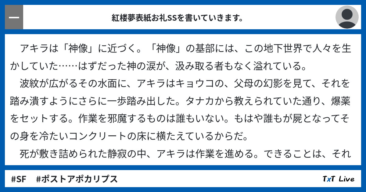 手に持っていたパジャマを羽織る。救急車はまずいと明滅する意識が告げる。たとえるなら赤信号だ。右目を押えていた手を外すと、どろ……となにかがほほを伝い落ちてくるのと同時に、手のひらにゼリーのような水っぽい固形物がくっついていた。